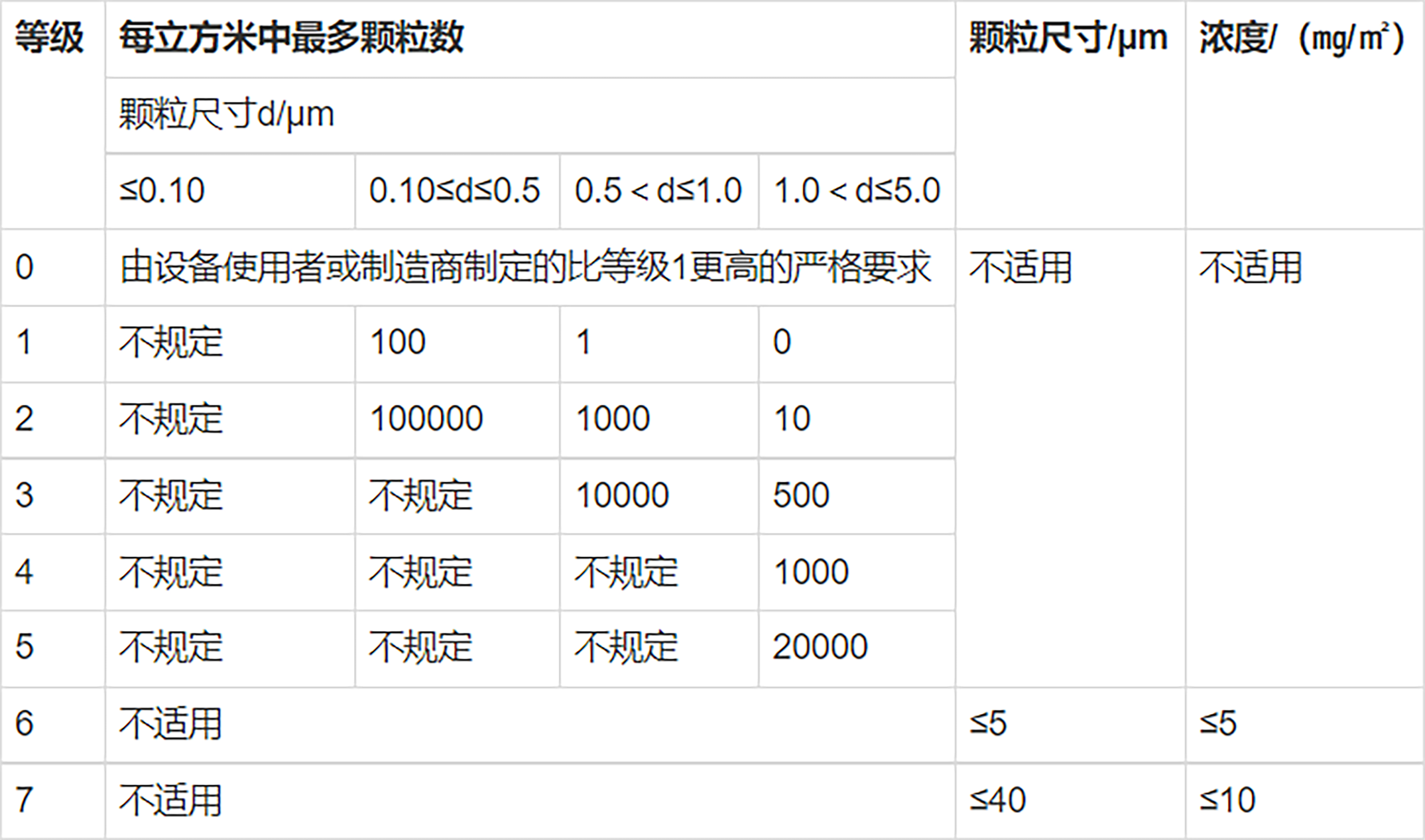 除上表的劃分方式外,壓縮氣體潔凈度等級也可參照潔凈室空氣潔凈度等級,即壓縮空氣中粒子濃度上限不超過所在壞境的空氣潔凈度粒子限度,不會對周圍環(huán)境造成污染,也可視為潔凈度達標。