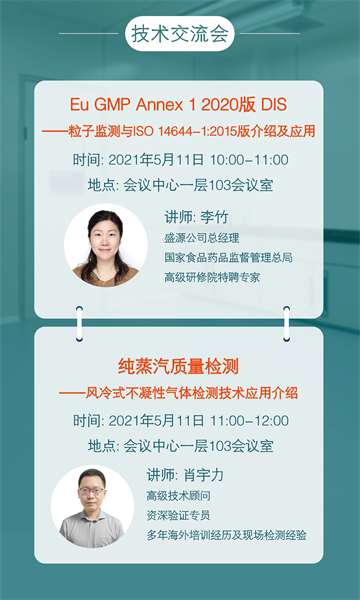 天津盛源受邀參加了5月11日10:00舉行的2021年中國國際制藥機械博覽會國際論壇及技術交流會。交流會主題是:潔凈廠房的檢測與確認。在本次交流會上李竹老師和肖宇力老師分別就《EU GMP Annex 1 2020版 DIS-粒子監(jiān)測與ISO 14644-1:2015版介紹及應用》與《純蒸汽質量檢測-風冷式不凝性氣體檢測技術應用介紹》進行了講解。全程干貨滿滿,精彩紛呈,會后諸多嘉賓都表示受益匪淺。現(xiàn)場座無虛席,觀眾們通過線上線下多渠道參會,會議現(xiàn)場氣氛熱烈,直播互動好評如潮。