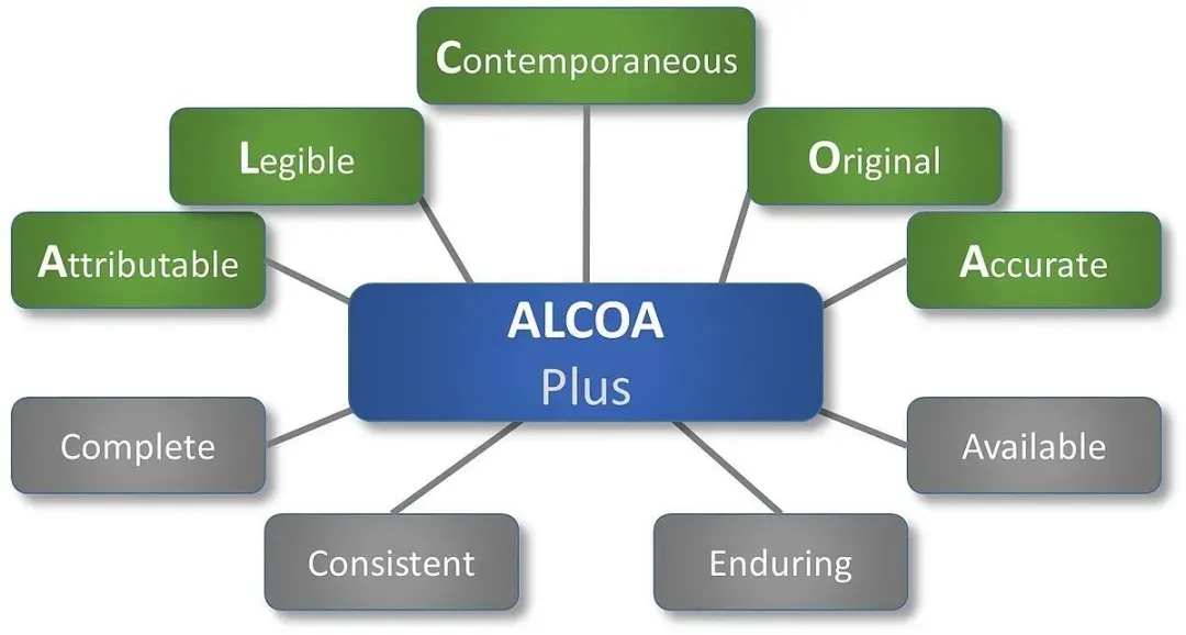 目前被公認(rèn)的數(shù)據(jù)完整性的原則是ALCOA+原則,即ALOCA+CCEA原則,其具體釋義如下: