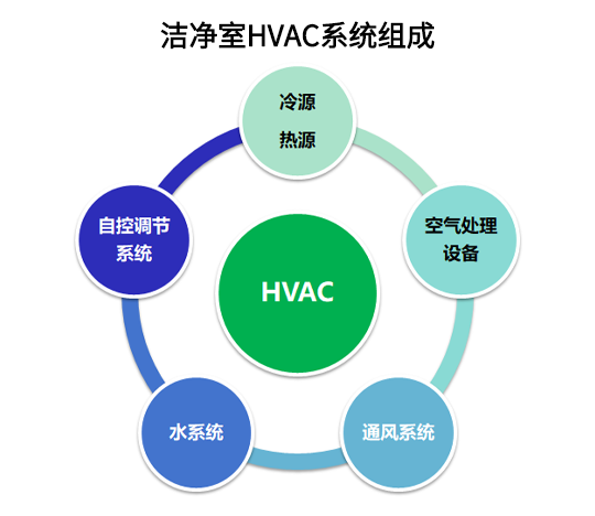 潔凈室作為空氣懸浮粒子受控的房間,在建造和使用時除了需要減少室內(nèi)引入,產(chǎn)生及滯留粒子之外,還需要對溫度、濕度、壓差等按要求進行控制,而實現(xiàn)上述參數(shù)人為可控的關(guān)鍵便是引入HVAC(供熱通風與空氣調(diào)節(jié))系統(tǒng),也就是我們常說的潔凈室空調(diào)系統(tǒng)。
