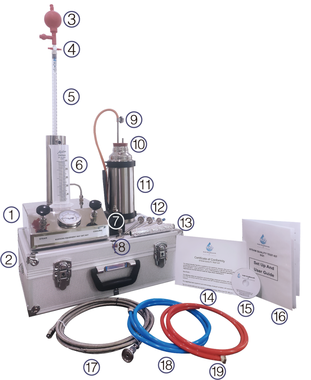 1.冷凝器及收集器 2.便攜式手提箱 3.滴定管橡膠球 4.滴定管閥門 5.滴定管 6.250ml量筒 7.冷卻水泵 8.連接接頭 9.卡子×2 10.帶不銹鋼汲取管的橡膠塞 11.不銹鋼真空瓶 12.皮托管(提供φ1.0mm) 13.過熱測試管 14.合格證 15.軟件 16.說明書 17.蒸汽管 18.冷卻水進(jìn)水管 19.冷卻水出水管 |